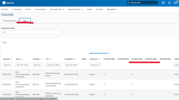 Velg «Fag». Du vil nå få opp informasjon om standpunktkarakterer og eksamenskarakterer